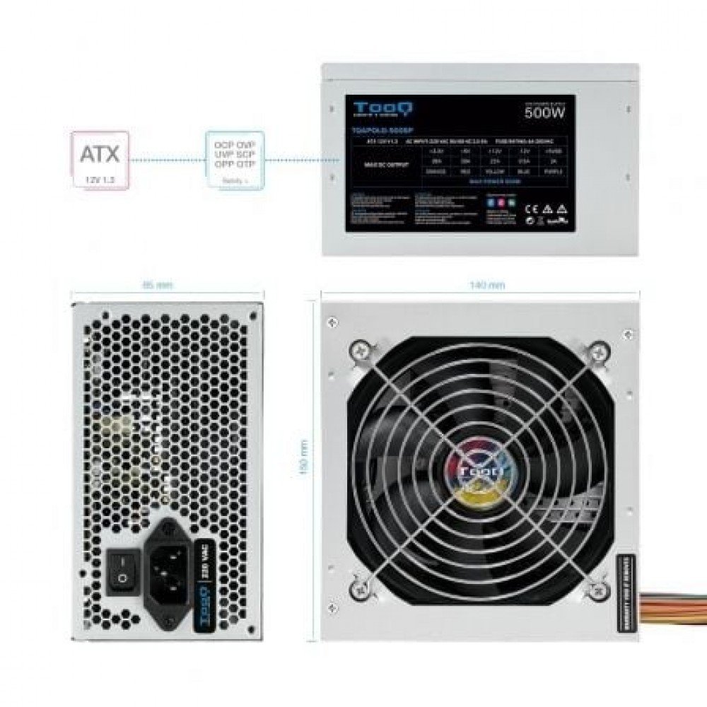 Especificaciones:. . Potencia: 500W (Eficiencia>;78%). PFC Activo. Tipo ATX 12V V1.3. Safety +: OCP, OVP, UVP, SCP, OPP, OTP. Ventilador silencioso de 120 mm con control automático de velocidad. Raíles: 1x +12V. Conectores:. 1 conector ATX (20 + 4 pines). 1 conector CPU (4 + 4 pines). 1 conectores PCI-E (6 pines). 2 conectores Molex. 4 conectores SATA. 1 conector FDD. Normativas: CE / RoHS. Color: Plata. Medidas del producto: 150x140x85 mm. Medidas del embalaje: 228x159x100 mm