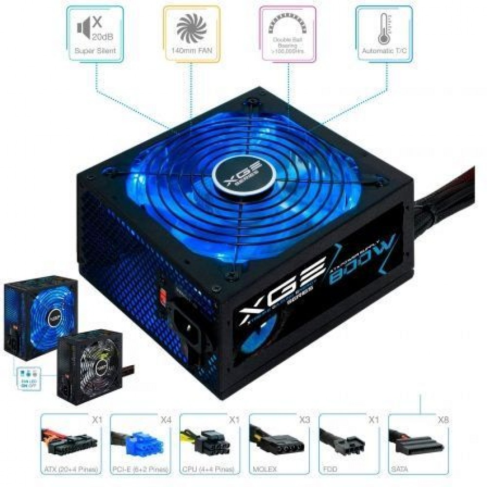 | Caracteristicas | - Potencia Máxima: 800W con certificado 80 PLUS BRONZE - PFC Activo (Eficiencia>82%) - Tipo: Intel ATX 12V V2.31 / EPS 12V V2.92 compatible con ATX12V V2.2, ATX12V V2.01 etc - Protecciones: sobretensión, sub tensión, cortocircuito, sobrecarga, sobre corriente, protección contra exceso de temperatura - Ventilador súper silencioso de 140mm con luz LED azul apagable y rodamiento fabricado con doble cojinete de bolas. (MTBF>80,000Hrs, Ruido<17dBA). Control automático de velocidad incorporado - Compatible con AMD/CrossFire y NVIDIA/SLi - Compatible con microprocesadores multi-núcleo de última generación - Cables extra largos para torres altas y todos los cables están mallados - Raíles de +12V: 2X +12V - Normativas: CE / UL / FCC / BSMI / GOST / CCC / KCC / ROHS - Medidas: 160 x 150 x 86mm - Tensión entrada: 90-240VAC (Automático) - Rango de frecuencia de entrada: 50/60Hz - +3.3V: 22A / +5V: 22A / +12V1: 30A / +12V2: 30A / -12V: 0.5A /+5VSB: 2A Conectores - 1 x ATX 24/20 pines, (500mm) x 1 - 1 x EPS/ATX 12V 8-4 pines, (600mm) x 1 - 2 x PCI-e 6+2 pines, (500+150mm) x 2 - 4 x SATA, (450+150+150+150mm) x 2 - 3 x 4 Pines (Periféricos)+1 x 4 Pines (Disquetera), (450 + 150 + 150 + 150 mm) x 1 Contenido - Fuente de alimentación XGE II - Cable de alimentación de 1,5 m - Hoja de instrucciones de multilenguaje |