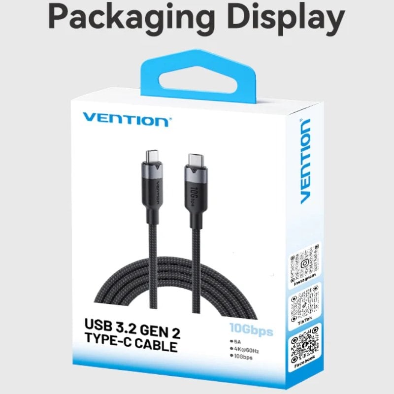 Vention Cable USB-C 3.2 Gen2 5A 100W Carga rapida 0.5m TRGBD Alu Negro